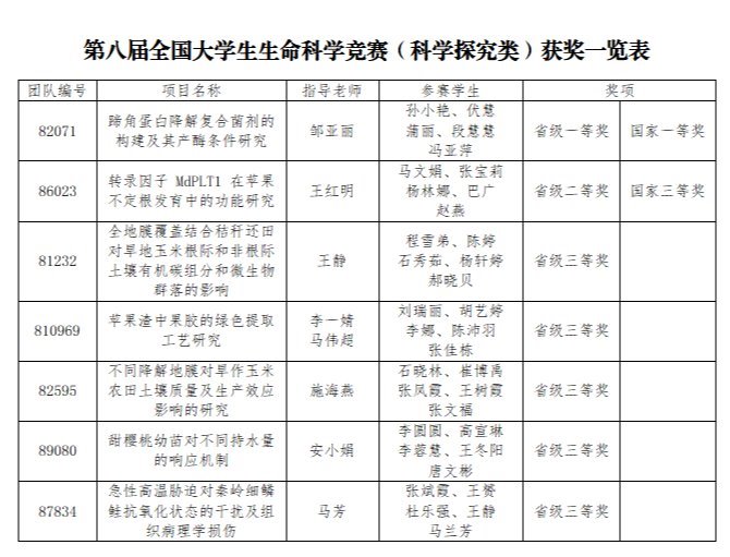 beat365官网共有8支团队参赛,最终获国家一等奖1项、三等奖1项;省级一等奖1项、二等奖1项、三等奖5项。由beat365官方网站邹亚丽老师指导,孙小艳、伏慧、蒲丽、段慧慧、冯亚萍完成的《蹄角蛋白降解复合菌剂的构建及其产酶条件研究》项目荣获国家一等奖(省级一等奖);由beat365官方网站王红明老师指导,马文娟、张宝莉、杨林娜、巴广、赵燕完成的《转录因子MdPLT1 在苹果不定根发育中的功能研究》项目荣获国家三等奖(省级二等奖)。