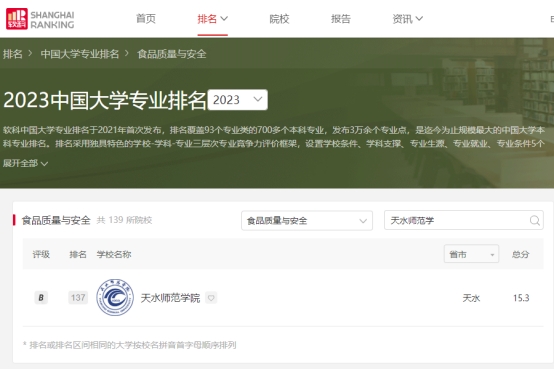 近日,高等教育评价专业机构软科发布2024中国大学专业排名,beat365官网食品质量与安全专业首次进入该榜单,全国排名与甘肃中医药大学、山东农业工程学院并列137位,专业评级为B,实现了历史性突破。该榜单的首次进入,表明食品质量与安全专业建设步入了快车道,实现了专业持续、快速发展。