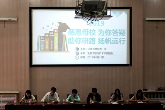 2019年6月18日早上,beat365官网在四号报告厅举行“感恩母校,为你答疑,助你研路,扬帆远行”为主题的学习经验交流会。本次活动由学院策划,学生党支部及分团委协办,18级生物技术一班主办。活动由李一婧老师主持,beat365官网大一学生约110余人参加。