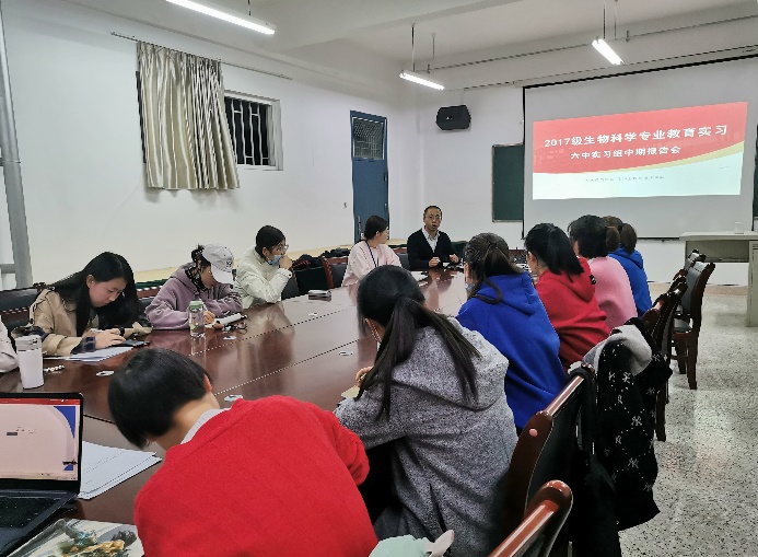 中期汇报会由生物科学系主任兼带队教师组长刘晓东主持,全体实习生参加了本次会议。他首先对一个多月的实习情况做了总结,教育专业实习不仅是人才培养的重要环节,也是打造实用型人才的主要途径,更是学校到社会的一次微跨越。随后,十三位实习生代表就自身教育实习内容、教学安排、感悟、反思等方面进行汇报发言。