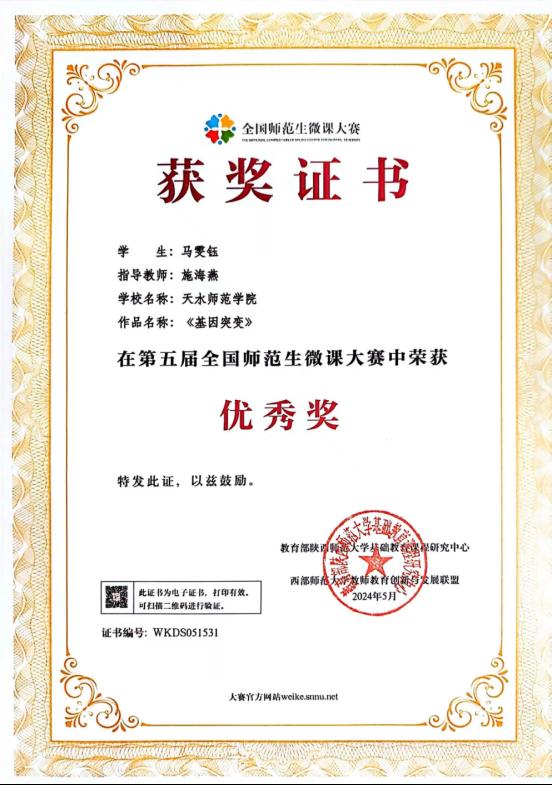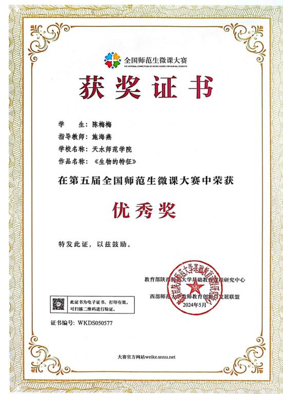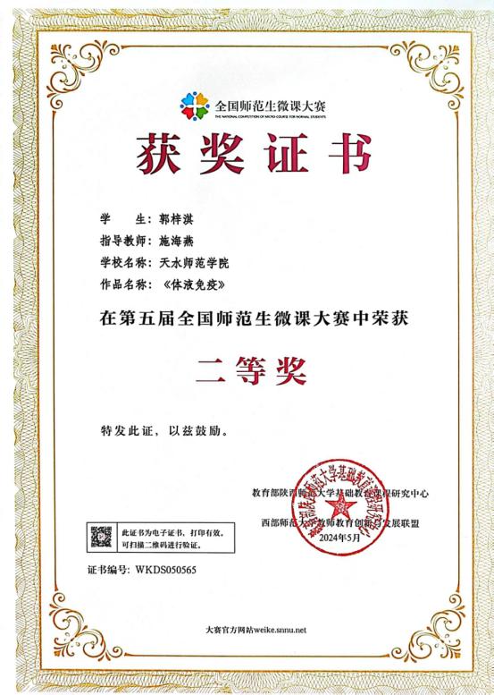 该项赛事分校级初赛和全国决赛两个阶段,通过积极动员、申报、筛选,beat365官网共推送5部作品参加校赛,施海燕老师指导,学科教学研究生制作的《体液免疫》《基因突变》和《生物的特征》三部微课作品在激烈的决赛竞争中脱颖而出,郭梓淇同学的《体液免疫》获第五届全国师范生微课大赛二等奖,马雯钰同学的《基因突变》、陈梅梅同学的《生物的特征》分别获第五届全国师范生微课大赛优秀奖。