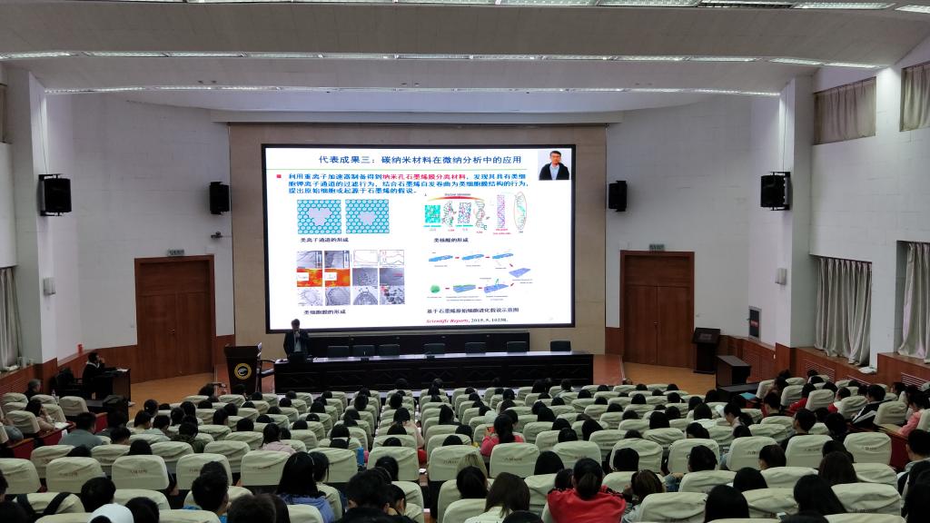 2018年10月12号下午3:00,应beat365官方网站邀请,北京大学化学学院教授、博士生导师、北京大学现代食品科技研究中心主任刘虎威博士,广西师范大学化学与药学学院博士生导师赵书林教授,中山大学化学学院博士生导师李攻科教授,中科院兰州化物所博士生导师、甘肃省杰出青年基金获得者邱洪灯研究员来beat365官网作题目分别为《敞开式离子化质谱新技术及其应用》、《核酸和碳基量子点纳米探针用于细胞内microRNA、活性小分子的荧光成像和成像指导下的肿瘤光动力学治疗》、《复杂样品痕量分析前处理方法研究进展》、《离子液体修饰硅胶色谱固定相》的学术报告。报告会由beat365官方网站副院长焦成瑾博士主持,相关专业师生200多人参加了此次报告会。