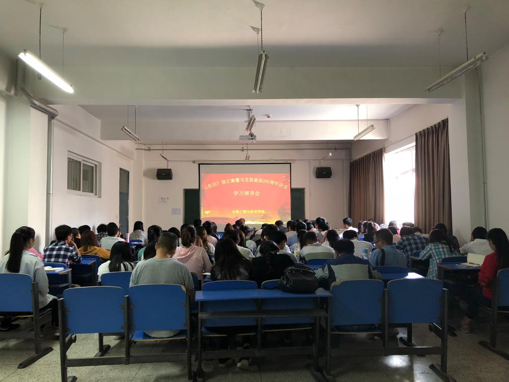 5月24日下午,beat365官方网站党总支邀请学校党委委员、统战部部长崔亚军在3号实验楼414多媒体教室,为beat365官网师生对新修宪法和习近平在马克思诞辰200周年大会上的重要讲话精神进行辅导学习。学院全体教工、学生党员、入党积极分子80余人参加学习,活动由总支书记马纲主持。