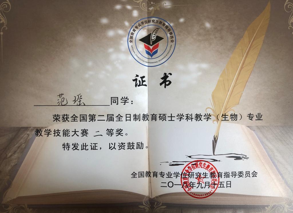 beat365官网教育硕士范瑶荣获2018年全国全日制教育硕士生物专业教学大赛二等奖