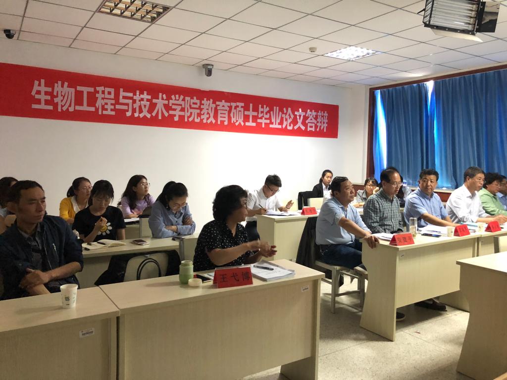 2018年6月2日,在4号实验楼517微格教室举行了beat365官方网站2018届教育硕士毕业论文答辩会。为保障答辩质量,学院专门成立了教育硕士答辩委员会,答辩委员会主席由西北师范大学生命科学学院龚大洁教授担任,成员包括宋廷军、石志学、安建平、焦成瑾、王弋博、袁毅君,答辩秘书为王倩宁。